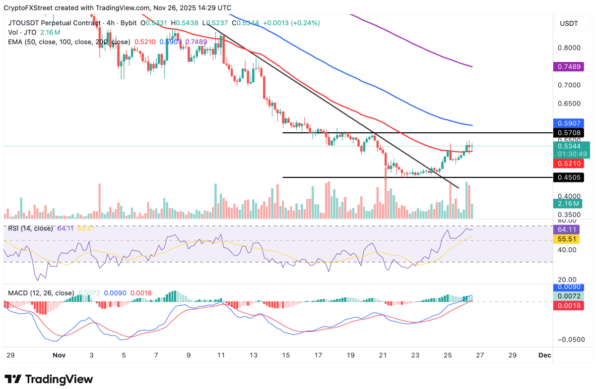 Jito hiện đang giao dịch quanh đường EMA 50 kỳ ở mức 0,52 USD trên khung 4 giờ, khi lực mua mạnh mẽ đẩy giá hướng tới kiểm soát xu hướng trong tuần này. Trước đó, đồng coin này từng chạm đáy 0,44 USD vào thứ Sáu, tạo nền tảng cho khả năng phục hồi ổn định.
