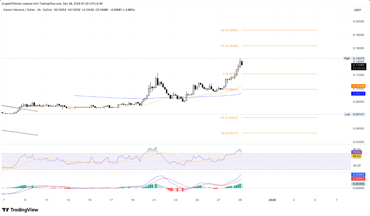 Vào thời điểm viết bài hôm thứ Hai, Canton giảm 4%, mở đầu tuần trên sắc đỏ sau khi vừa ghi nhận mức tăng ấn tượng 23% vào Chủ Nhật. Đợt điều chỉnh này, nối tiếp chuỗi ba ngày tăng liên tiếp, đang đặt áp lực kiểm định lại Pivot Point trung tâm tại $0,1215 trên khung 4 giờ, trước khi hướng tới mốc tâm lý quan trọng $0,1000.