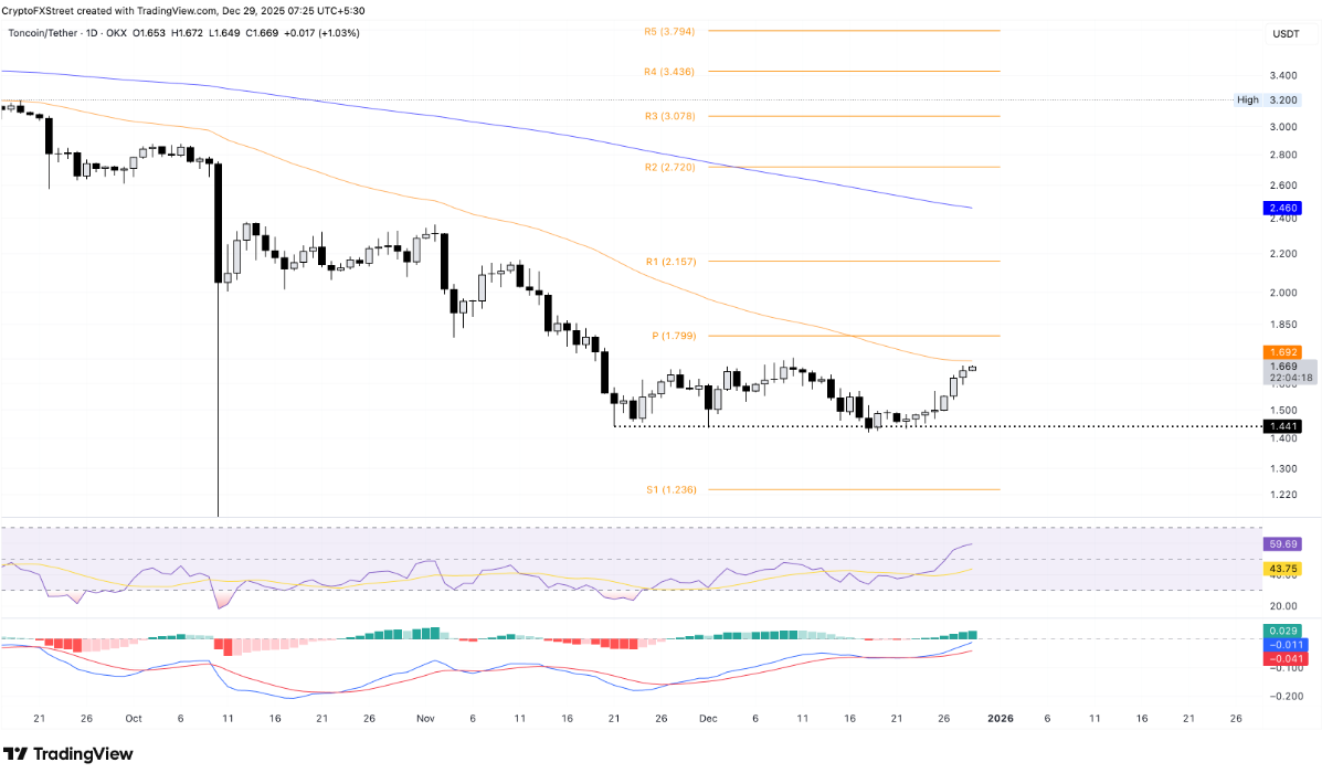 Trong trường hợp TON gặp áp lực điều chỉnh từ mức $1,69, đồng coin này có khả năng kiểm tra lại ngưỡng hỗ trợ $1,444 — mức đã giữ vững kể từ ngày 21/11.