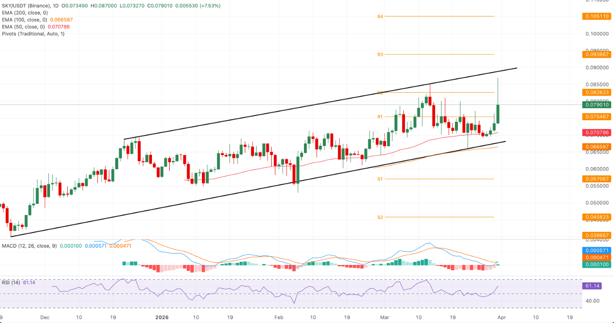 Sky tăng hơn 7% trong phiên thứ Ba, đánh dấu ngày phục hồi thứ tư liên tiếp trong kênh giá tăng trên khung ngày. Mốc kháng cự gần nhất nằm tại Pivot R2 quanh 0,08262 USD; nếu giá đóng cửa vượt ngưỡng này, đà tăng có thể được nối dài lên đường xu hướng phía trên, xấp xỉ 0,08500 USD.