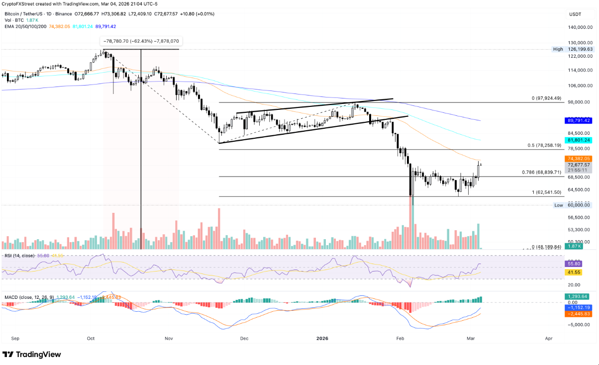 Ở chiều ngược lại, khu vực bứt phá trước đó gần mức Fibonacci 78,6% tại 68.839 USD nhiều khả năng sẽ đóng vai trò là vùng hỗ trợ quan trọng nếu thị trường xuất hiện nhịp điều chỉnh.