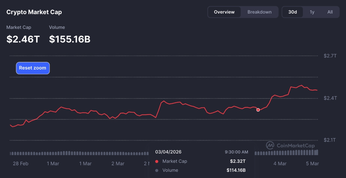 Đà phục hồi của Bitcoin đang lan tỏa tích cực ra toàn bộ thị trường tiền điện tử, góp phần cải thiện rõ rệt tâm lý nhà đầu tư. Tại thời điểm viết bài vào thứ Năm, tổng vốn hóa thị trường tiền điện tử đã tăng lên khoảng 2,43 nghìn tỷ USD, cao hơn hơn 5% so với mức 2,32 nghìn tỷ USD ghi nhận một ngày trước đó, cho thấy dòng tiền đang dần quay trở lại thị trường.