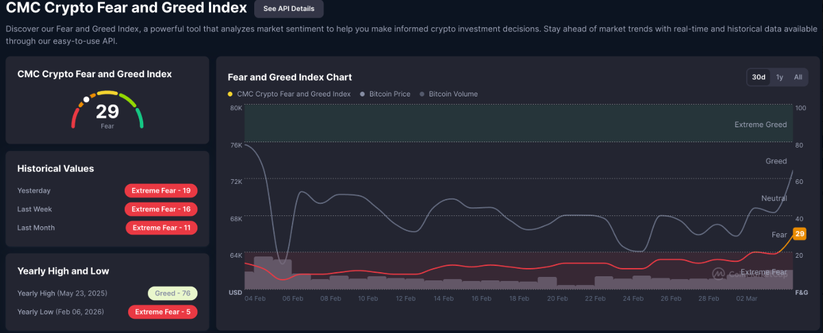 Song song với đó, chỉ số Crypto Fear & Greed Index do CoinMarketCap công bố cũng ghi nhận sự cải thiện đáng kể, khi tăng từ 19 điểm vào thứ Tư lên 29 điểm. Diễn biến này cho thấy áp lực từ phe gấu đang dần suy yếu. Tuy vậy, việc chỉ số vẫn nằm dưới ngưỡng 40 cho thấy tâm lý chung của thị trường vẫn đang ở trạng thái sợ hãi. Vùng trung lập của chỉ số nằm trong khoảng 40–60, và chỉ khi vượt mốc 60 — ngưỡng thể hiện tâm lý tham lam — thị trường mới có thể xác nhận một xu hướng tăng giá mạnh mẽ hơn.