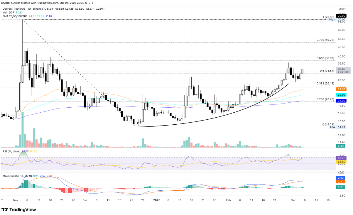 Tiền điện tử chú trọng quyền riêng tư này đang giao dịch trên mức Fibonacci thoái lui 50% tại 31,54 USD, được đo từ đỉnh 70 USD thiết lập ngày 4/11 đến đáy 14,21 USD ngày 23/12. Nếu DCR có thể đóng cửa thuyết phục trên vùng giá này, mục tiêu tiếp theo có thể hướng tới mức Fibonacci 61,8% tại 38,07 USD.