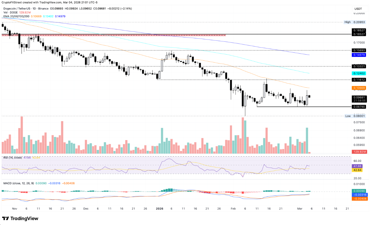 Trong khi đó, Dogecoin tiếp tục đối mặt với áp lực điều chỉnh khi tiến sát vùng 0,1000 USD – mốc từng chặn đứng đà tăng gần 10% của đồng coin này trong phiên thứ Tư. Tính đến thời điểm viết bài, DOGE giảm khoảng 2% trong phiên thứ Năm. Các đường EMA 50 ngày và 200 ngày vẫn dốc xuống, đóng vai trò là vùng kháng cự phía trên và làm suy yếu những nỗ lực phục hồi trong ngắn hạn.