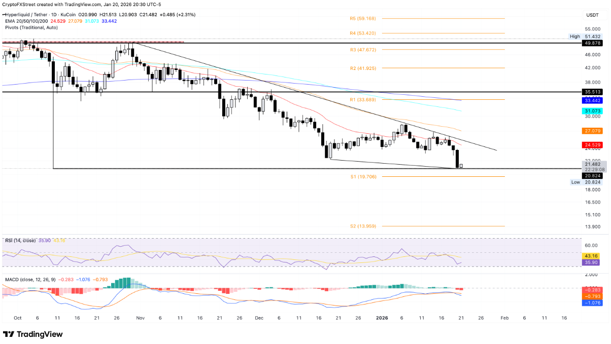 Nếu HYPE tiếp tục đóng cửa dưới mức thấp ngày 10/10 tại 20,82 USD, giá có thể kiểm tra S1 Pivot Point quanh 19,70 USD, mở ra nguy cơ điều chỉnh sâu hơn. Ngược lại, một đà hồi phục bền vững từ mốc 20 USD sẽ đối mặt kháng cự ngay tại EMA 20 ngày, quanh 24,52 USD.