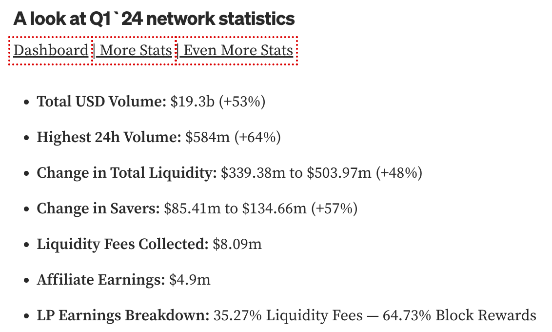 Ngoài ra, hệ sinh thái của THORChain cũng đã được mở rộng đáng kể, với khối lượng, tính thanh khoản và mức độ tương tác của người dùng đi lên theo thời gian. Theo báo cáo, khối lượng của nền tảng này đã tăng 53%, thanh khoản tăng 48% và số lượng saver tăng 57% trong quý đầu tiên của năm 2024. Những số liệu nổi bật này cho thấy mức độ áp dụng và sử dụng các dịch vụ của THORChain đang ngày càng tăng cao.