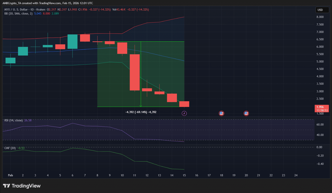 Chỉ báo RSI rơi xuống mức 26, đưa MYX vào vùng quá bán sâu, trong khi CMF duy trì giá trị âm — một tín hiệu rõ ràng cho thấy dòng tiền đang rút khỏi thị trường.
