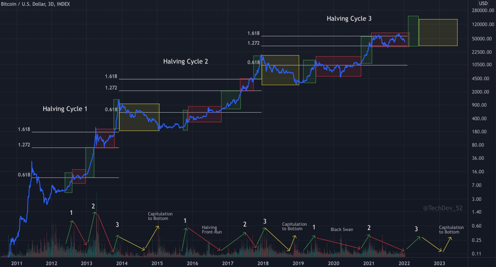 Bitcoin sẽ sớm chạm tới đáy của đợt điều chỉnh, tương tự như mũi tên màu vàng thứ hai trong các chu kỳ trước.