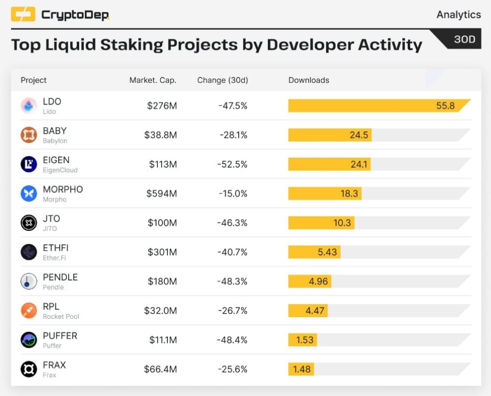 Không chỉ nổi bật về mặt giá, Morpho còn góp mặt trong nhóm những dự án liquid staking dẫn đầu về mức độ hoạt động của đội ngũ phát triển trong 30 ngày gần đây. Sự quan tâm ngày càng lớn từ cộng đồng developer có thể đang đóng vai trò quan trọng trong việc củng cố niềm tin của nhà đầu tư đối với dự án.