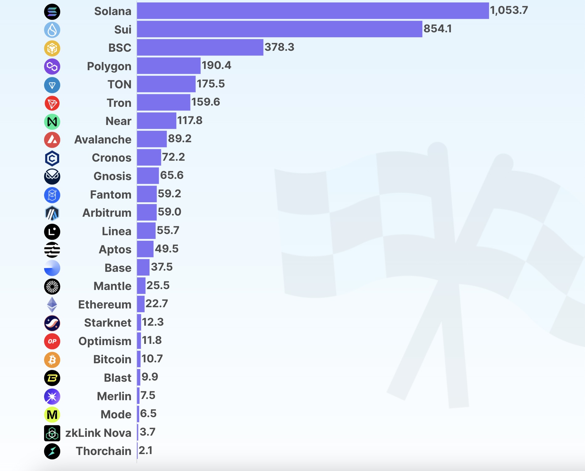 Ethereum và 10 giải pháp mở rộng lớn nhất của nó đã có tổng TPS thực tế là 500, đặt tốc độ xử lý kết hợp của chúng cao hơn BSC nhưng vẫn chậm hơn Solana và Sui. Bên cạnh Polygon, 4 giải pháp mở rộng quy mô khác đã được chứng minh là nhanh hơn Ethereum (23 TPS) bao gồm Arbitrum (59 TPS), Linea (56 TPS), Base (37 TPS) và Mantle (25 TPS).