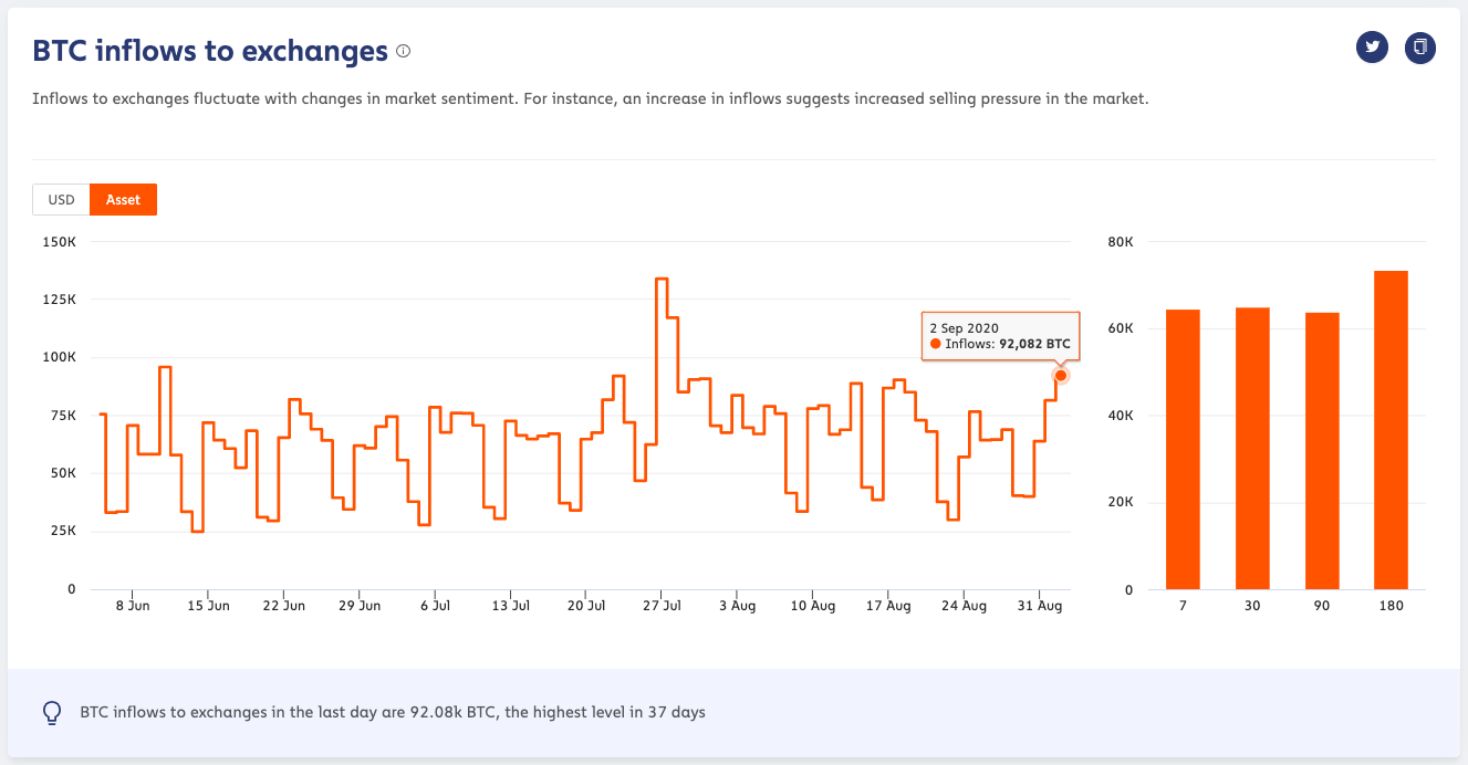 Kể từ khi sự sụt giảm xảy ra trên thị trường, lượng BTC chảy vào các sàn giao dịch đã đạt mức cao nhất kể từ tháng Bảy. Điều này có nghĩa là lần đầu tiên kể từ khi Bitcoin tăng vọt hơn 10.000 đô la vào hai tháng trước, thực sự có động lực lớn hơn để bán, thay vì mua hoặc thậm chí là hodl. Tuy nhiên, ETH đang tệ hơn. Dòng tiền chảy vào các sàn giao dịch của ETH đã đạt đến điểm cao nhất kể từ tháng 3, khi ETH được giao dịch dưới 100 đô la và bây giờ nó dưới 400 đô la.