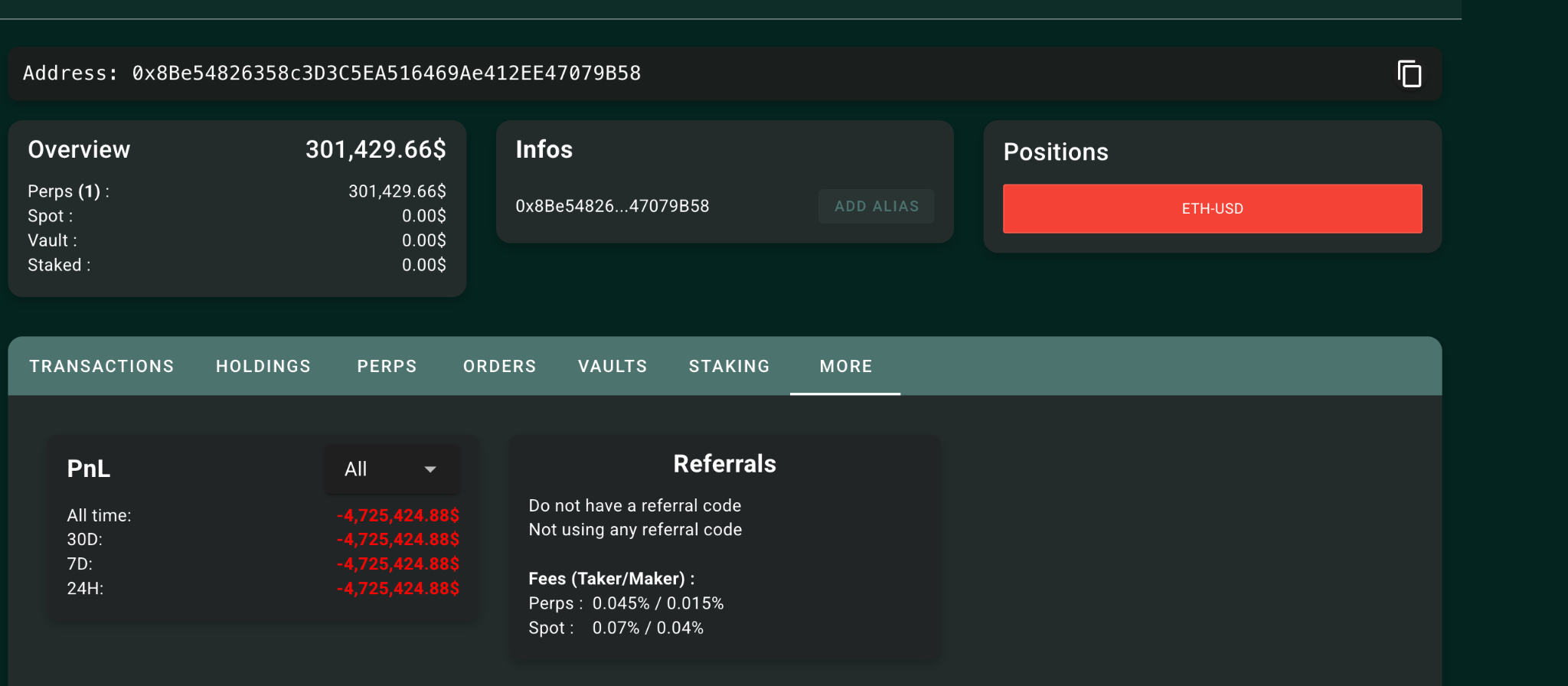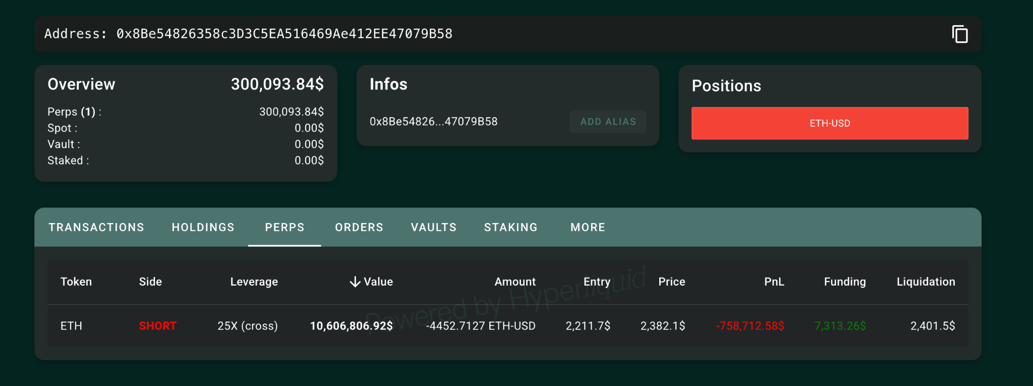 Theo dữ liệu từ nền tảng phân tích HypurrScan, địa chỉ này đang nắm giữ vị thế short ETH với quy mô hơn 4.452 ETH, sử dụng đòn bẩy 25x, với mức giá vào lệnh là 2.211,7 USD. Tuy nhiên, giá ETH hiện đã vượt 2.382 USD, đẩy khoản lỗ chưa thực hiện (unrealized PnL) của trader này lên tới -758.712 USD chỉ riêng trên vị thế hiện tại.