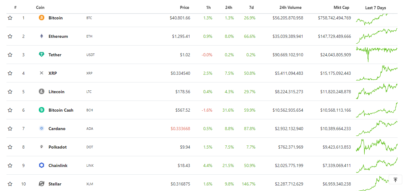 Động lực tăng giá được thấy trong suốt tuần đã tràn sang cuối tuần khi phần lớn 100 token hàng đầu trên CoinMarketCap đang tăng hai chữ số.