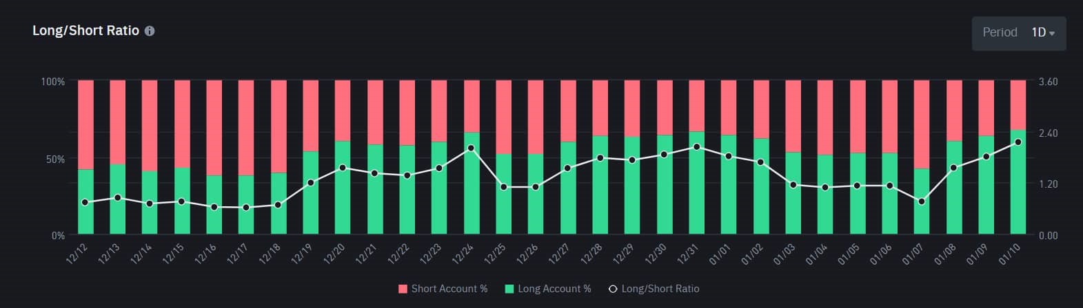 Tính đến thời điểm viết bài, tỷ lệ phần trăm thay đổi đáng kể theo hướng có lợi cho các khoản cược tăng giá, với 68,28% tài khoản Binance hàng đầu nắm giữ vị thế Long tính đến ngày 10/1, báo hiệu kỳ vọng chung rằng BTC sẽ tăng ít nhất trong một thời gian.