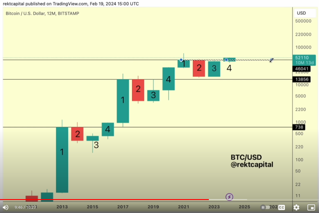 Trong một video mới trên Youtube, nhà phân tích ẩn danh Rekt Capital chia sẻ với 86.100 người theo dõi rằng Bitcoin thường tuân theo chu kỳ bốn năm dựa trên sự kiện halving – khi phần thưởng cho thợ đào BTC bị cắt giảm một nửa.