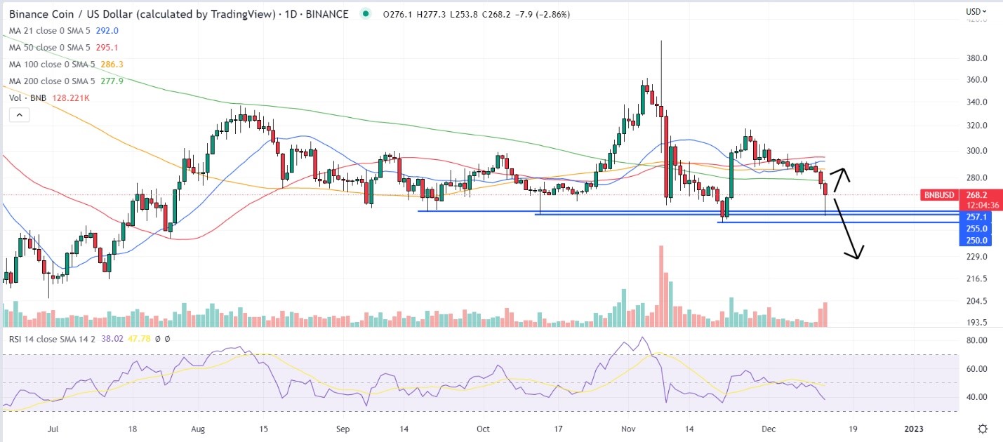 Hiện tại, BNB đang giữ trên mức hỗ trợ trong khu vực 250 đô la được giữ vững từ mùa hè. Nhưng những dự đoán về giá BNB đang trở nên bi quan hơn khi nỗi sợ hãi, sự không chắc chắn và nghi ngờ (FUD) lan rộng liên quan đến khả năng thanh toán của sàn giao dịch Binance, chỉ hơn một tháng sau vụ sụp đổ đột ngột của FTX, đối thủ cũ của Binance.