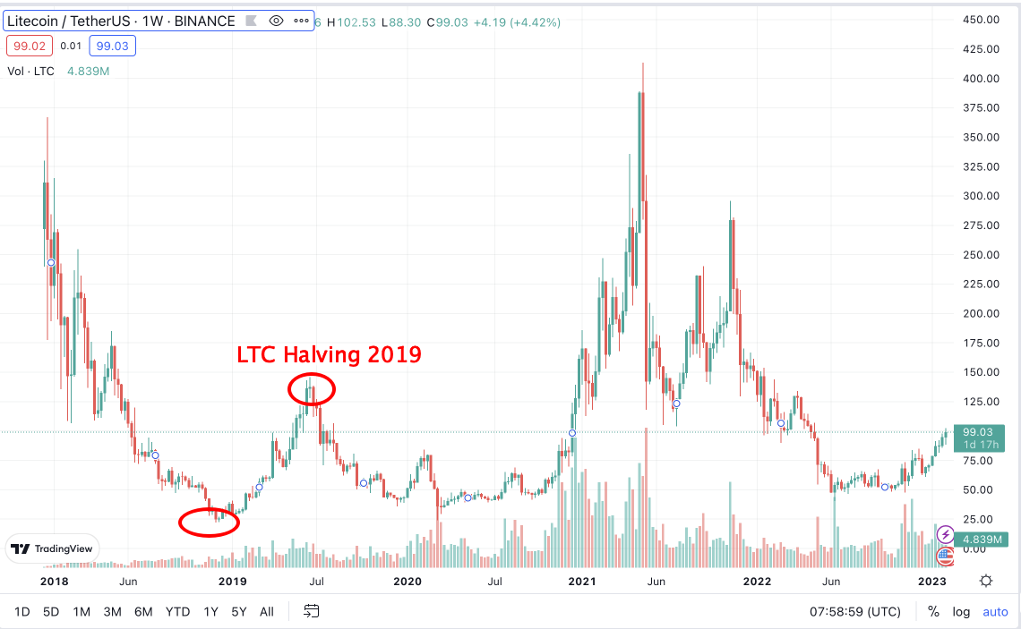 Theo đánh giá của nhiều nhà phân tích, giá Litecoin có thể sẽ tăng trước khi halving dự kiến sẽ diễn ra vào ngày 3 tháng 8 năm 2023. Các nhà phân tích cho rằng giá Litecoin có thể đạt mức cao nhất trong vòng 2 năm nay. Halving có nghĩa là số lượng Litecoin phát hành ra mỗi block sẽ giảm tới 50%. Điều này có nghĩa là lượng LTC có thể tăng giá nhờ vào áp lực của nhu cầu và tỷ lệ cung/cầu.