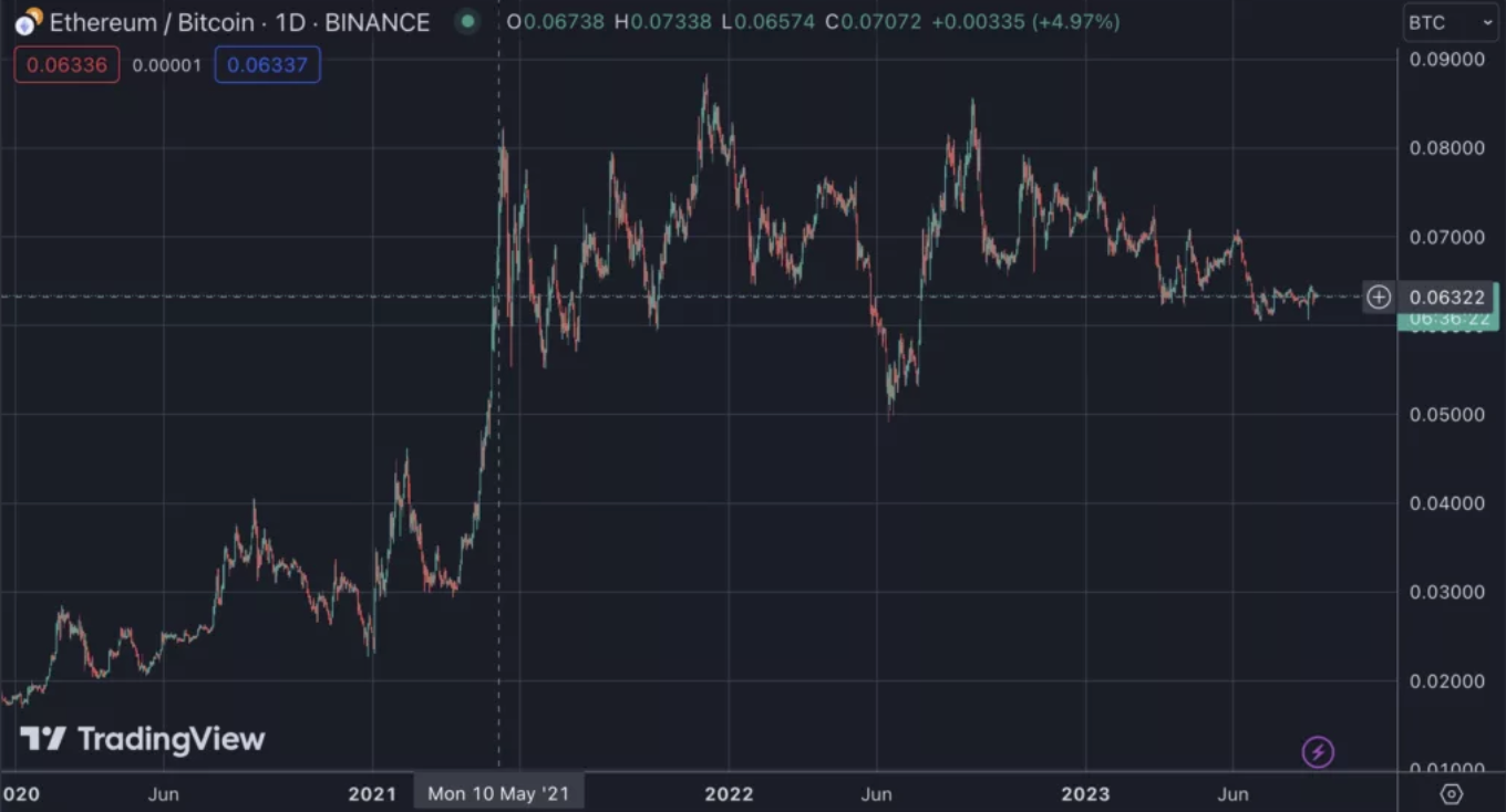 Thay vì tăng đáng kể so với Bitcoin do nguồn cung của nó trở nên giảm phát, giá trị của ETH so với BTC đã đi ngang đến mức đạt được lần đầu tiên vào năm 2021 khi Ethereum vẫn có tỷ lệ lạm phát khoảng 4% một năm.