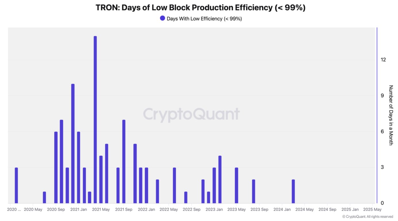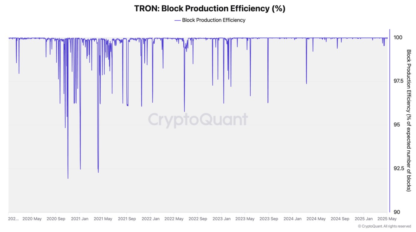 Theo dữ liệu mới từ CryptoQuant, mạng lưới TRON đang ghi nhận những bước tiến ấn tượng về hiệu suất và cấu trúc quản trị. Cụ thể, TRON đã đạt 99,7% hiệu suất tạo khối – một con số cho thấy độ ổn định cao và khả năng duy trì hoạt động mạng gần như hoàn hảo trong thời gian dài.
