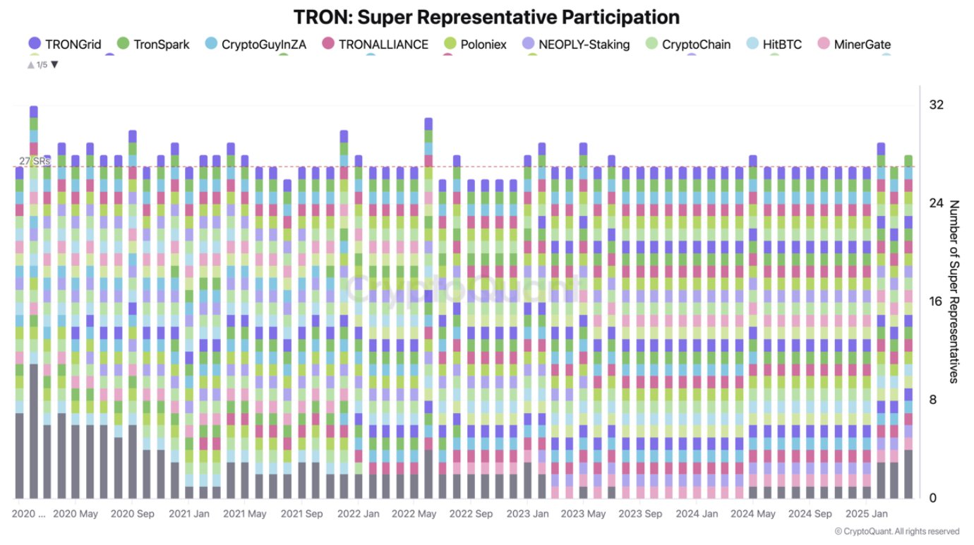 Không chỉ vậy, kể từ năm 2020, TRON đã âm thầm thay thế đến 68% các đại biểu Super Representatives – những node quan trọng tham gia xác thực và sản xuất khối trong mạng lưới. Việc luân chuyển lực lượng đại diện này được xem là yếu tố giúp duy trì sự phi tập trung, tăng cường bảo mật và tránh tình trạng quyền lực tập trung quá lâu vào một nhóm node cụ thể.