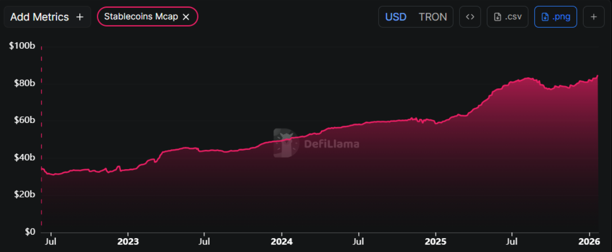 Song song đó, số liệu từ DefiLama cho thấy tổng nguồn cung stablecoin trên mạng Tron đã tăng đều từ cuối tháng 12, lập đỉnh lịch sử 84,63 tỷ USD vào thứ Tư trước khi ổn định quanh mức 84,43 tỷ USD vào thứ Sáu. Đà mở rộng của stablecoin phản ánh nhu cầu sử dụng mạng lưới ngày càng lớn, qua đó cải thiện thanh khoản, thúc đẩy hoạt động on-chain và củng cố triển vọng tăng giá dài hạn cho hệ sinh thái Tron.