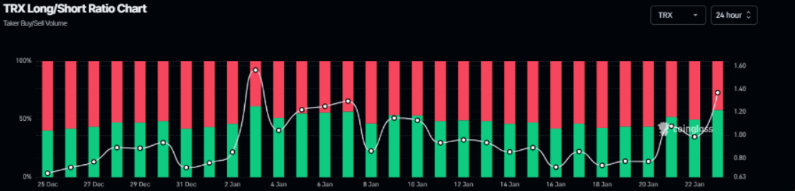 Ở mảng phái sinh, theo Coinglass, tỷ lệ long/short của TRX đạt 1,36 vào thứ Sáu, tiệm cận mức cao nhất trong vòng một tháng. Việc tỷ lệ này duy trì trên ngưỡng 1 cho thấy phần lớn trader đang nghiêng về kịch bản giá Tron tiếp tục đi lên.