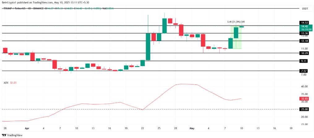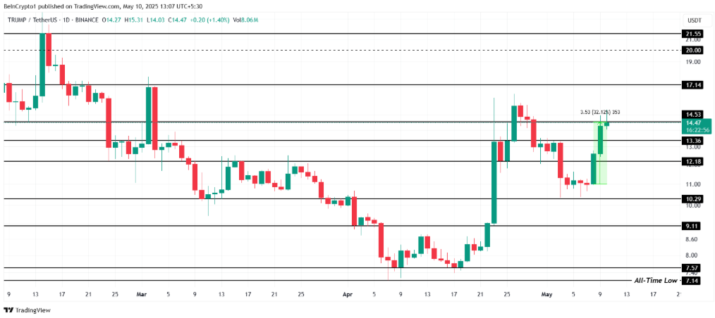TRUMP hiện đang giao dịch quanh $14,18, ghi nhận mức tăng 15% trong tuần qua. Altcoin này đang tiến gần đến mức kháng cự quan trọng tại $14,53, với mục tiêu tiếp theo là $17,14.