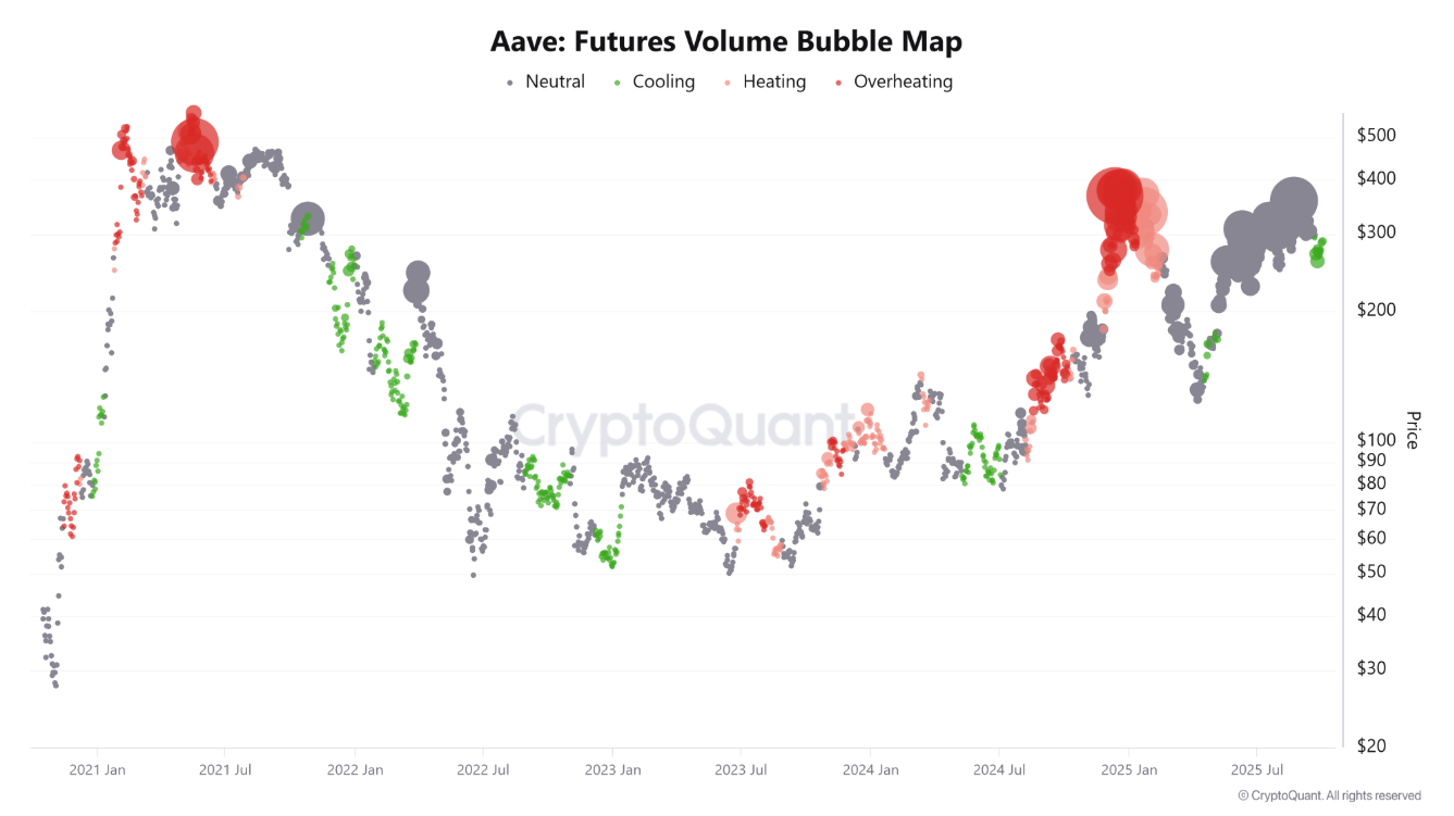 Ở mảng phái sinh, chỉ báo Futures Volume Bubble Map của CryptoQuant – công cụ đo lường quy mô trung bình của các lệnh AAVE – cho thấy khối lượng giao dịch lớn hơn hẳn, hàm ý sự tham gia mạnh mẽ từ các “cá voi”. Đây được xem là tín hiệu củng cố thêm cho triển vọng tích cực của AAVE trong ngắn hạn.