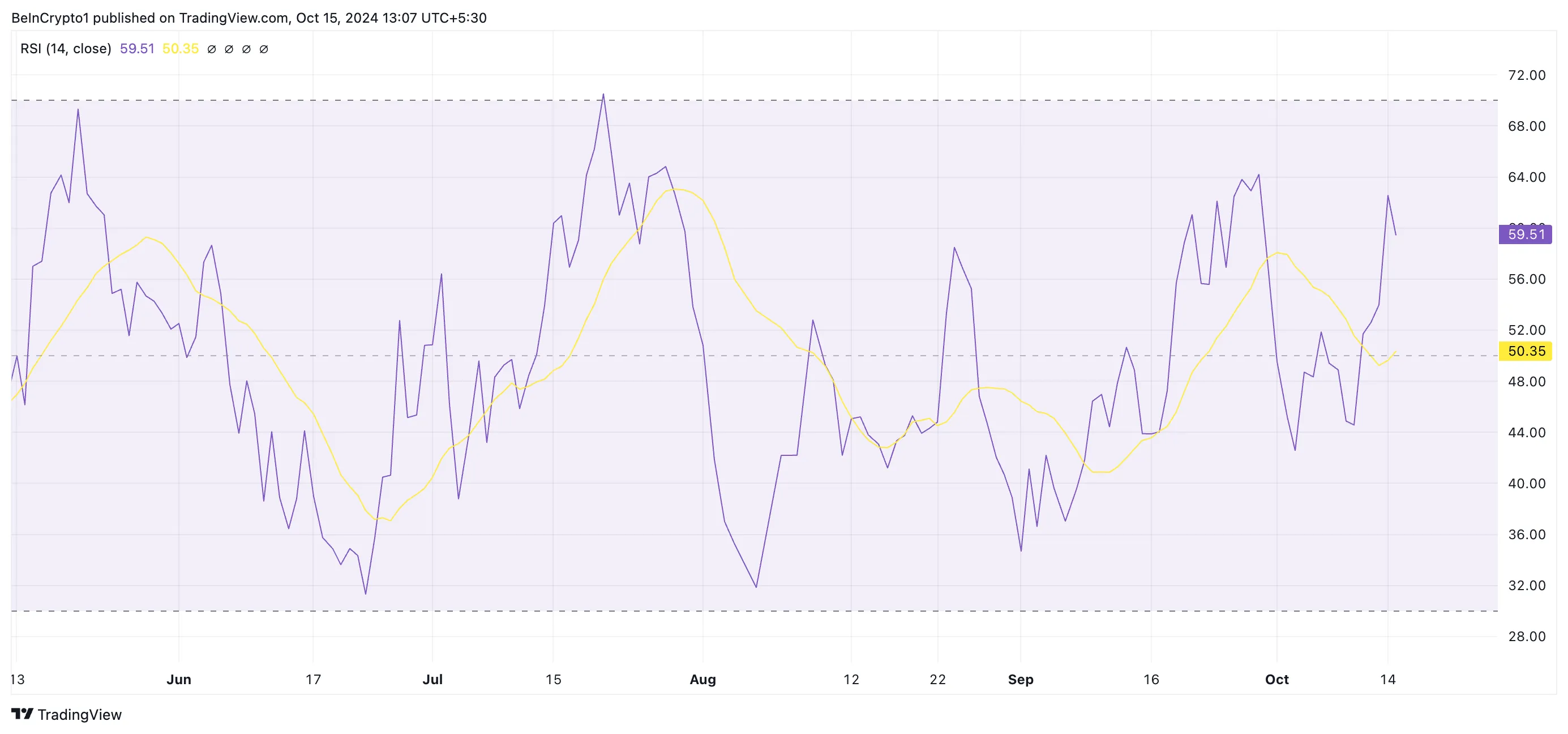 Chỉ số sức mạnh tương đối (RSI) của SOL hỗ trợ triển vọng tăng giá này. Ở mức 59,51, RSI, đo lường tình trạng thị trường quá bán và quá mua, cho thấy Solana đang mạnh lên và trải qua xu hướng tăng giá.