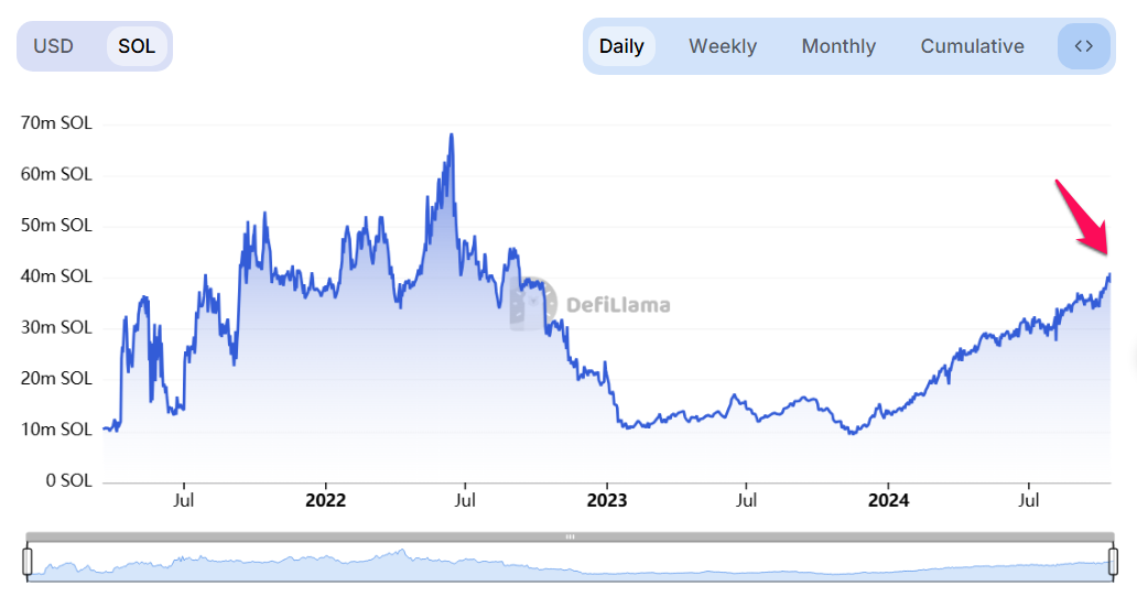 TVL phản ánh tổng giá trị tài sản mà người dùng gửi vào các dự án. Mức tăng TVL thường là chỉ báo cho thấy sự tin tưởng và mức độ tương tác của người dùng với nền tảng ngày càng gia tăng. Tính đến ngày 15 tháng 10, hơn 40 triệu token SOL đã bị khóa trong các giao thức DeFi, tăng từ 14 triệu SOL vào đầu năm 2024, theo dữ liệu từ DefiLlama.