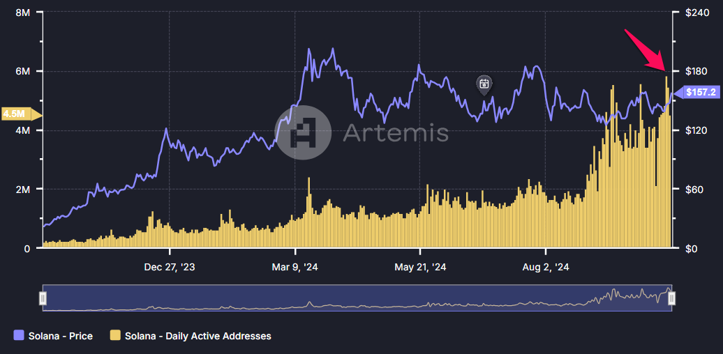 Trong khi đó, dữ liệu từ Artemis cho thấy số địa chỉ hoạt động hàng ngày (DAA) trên mạng Solana đã đạt kỷ lục mới, với hơn 4 triệu địa chỉ hoạt động trong một số ngày nhất định trong tháng 10. Từ tháng 9, DAA đã duy trì trên mức 3 triệu mỗi ngày.