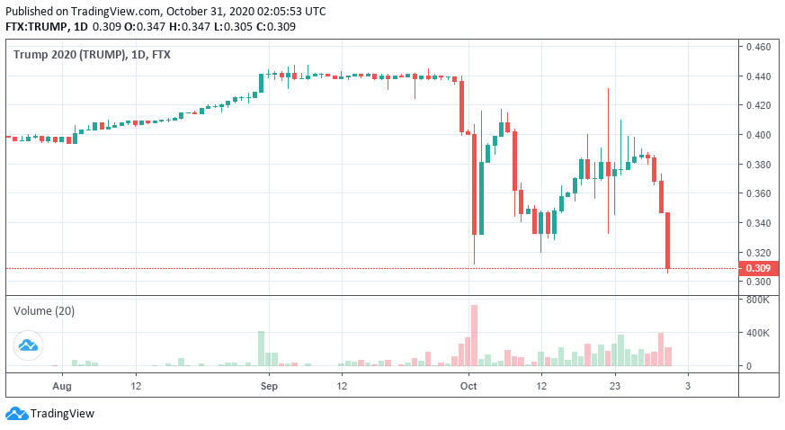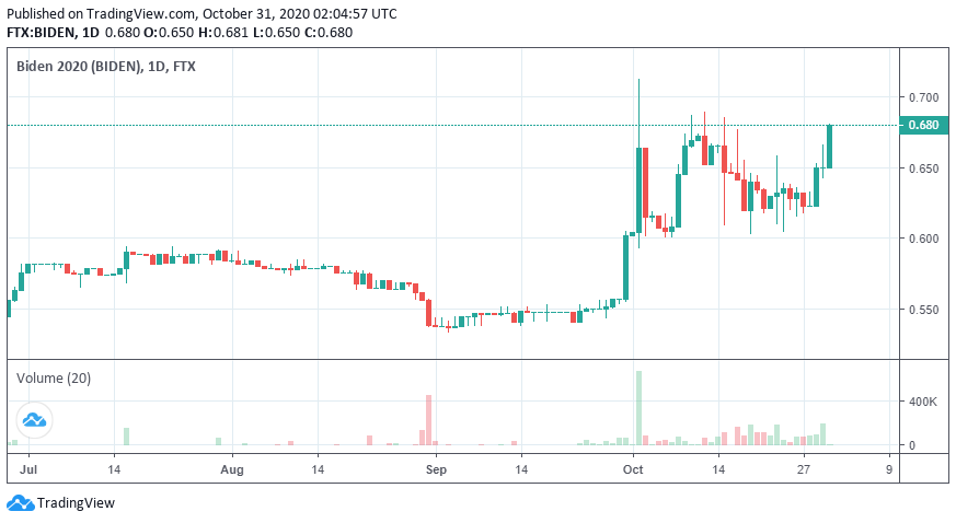 Nhìn vào biểu đồ có thể thấy rằng các trader đang đặt cược Joe Biden giành chiến thắng trong cuộc bầu cử tại Hoa Kỳ. Token BIDEN đang hoán đổi ở mức giá từ 0,67 đô la đến 0,69 đô la tại thời điểm viết bài. Trong khi đó, TRUMP đang hoán đổi ở mức giá từ 0,34 đô la đến 0,38 đô la một token, có nghĩa là dự đoán Donald Trump thất cử đang tăng lên.