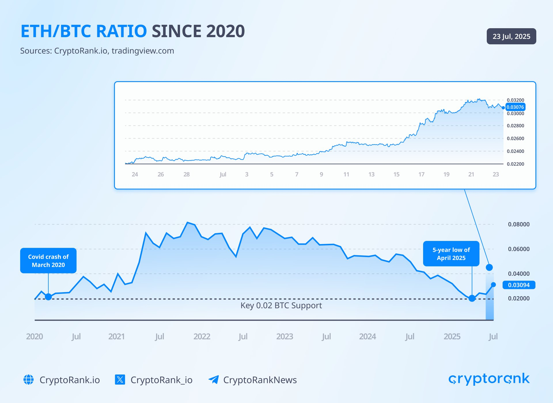 Tỷ lệ ETH/BTC đã tăng khoảng 40% trong tháng qua, từ vùng đáy ~0.022 vào ngày 23/6 lên khoảng 0.031 hiện tại. Động lực chính đến từ mức tăng giá hơn 60% của Ethereum trong tháng 7, nhờ dòng vốn ETF spot ETH và sự quan tâm ngày càng lớn từ các tổ chức.