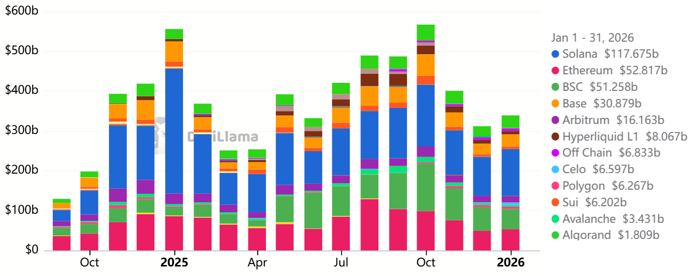 Sự suy giảm quan tâm đối với các ứng dụng phi tập trung (dApp) cũng khiến nhu cầu nắm giữ ETH giảm đáng kể. Khối lượng giao dịch trên các sàn DEX của Ethereum đạt 52,8 tỉ USD trong tháng 1, giảm mạnh so với mức 98,9 tỉ USD hồi tháng 10/2025. Mức sụt giảm 47% này làm suy yếu động lực nắm giữ, do nhu cầu xử lý giao dịch cao thường kích hoạt cơ chế đốt phí, giúp giảm nguồn cung ETH lưu hành.