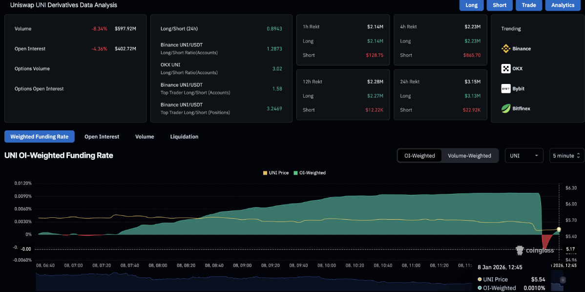 Ở thị trường phái sinh, dữ liệu từ CoinGlass cho thấy hợp đồng mở của hợp đồng tương lai UNI đã giảm 4,36% trong vòng 24 giờ qua, xuống còn 402,72 triệu USD, cho thấy các trader đang chủ động thu hẹp rủi ro bằng cách đóng bớt vị thế hoặc hạ đòn bẩy.
