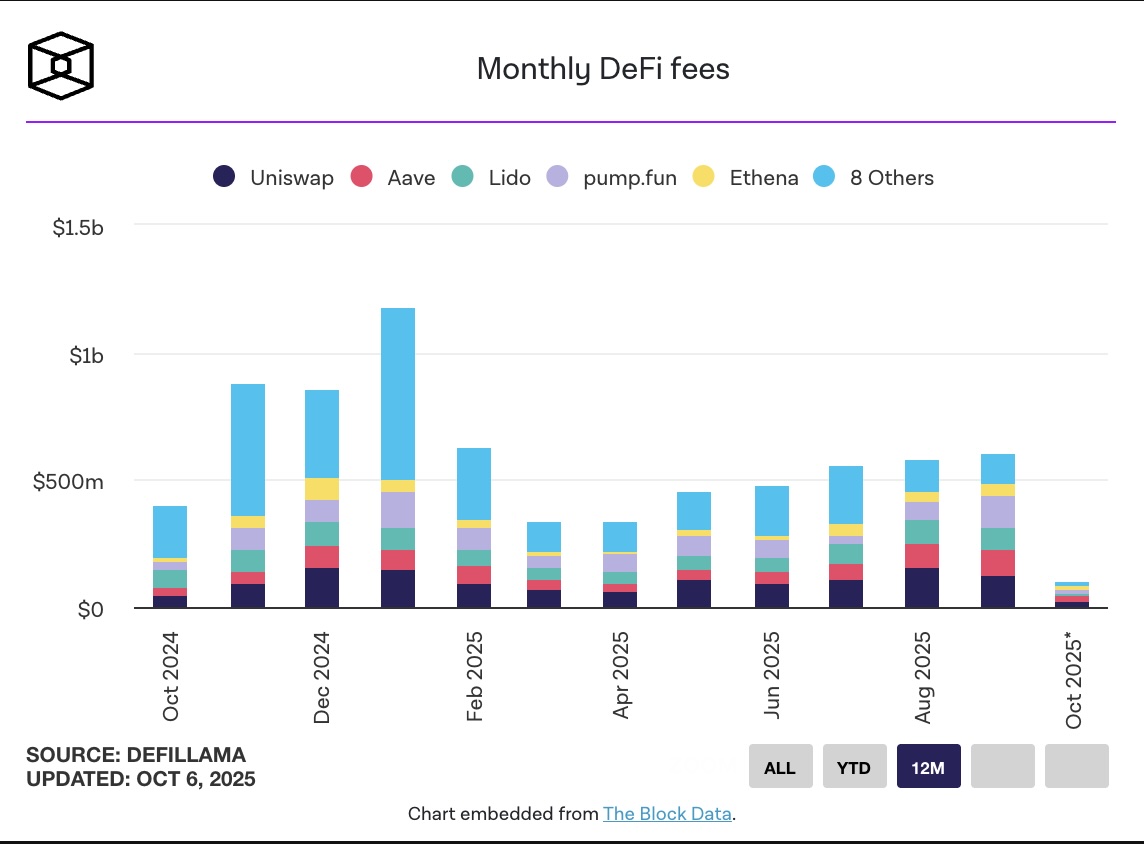 Các giao thức tài chính phi tập trung (DeFi) đã tạo ra khoảng 600 triệu USD phí trong tháng 9, phục hồi đáng kể so với mức thấp nhất trong 12 tháng là 340 triệu USD hồi tháng 3. Mức tăng 76% trong nửa năm qua cho thấy sự trở lại mạnh mẽ của lĩnh vực này, với những cái tên dẫn đầu như Uniswap, AaveEthena tiếp tục chiếm ưu thế trong việc tạo doanh thu phí.