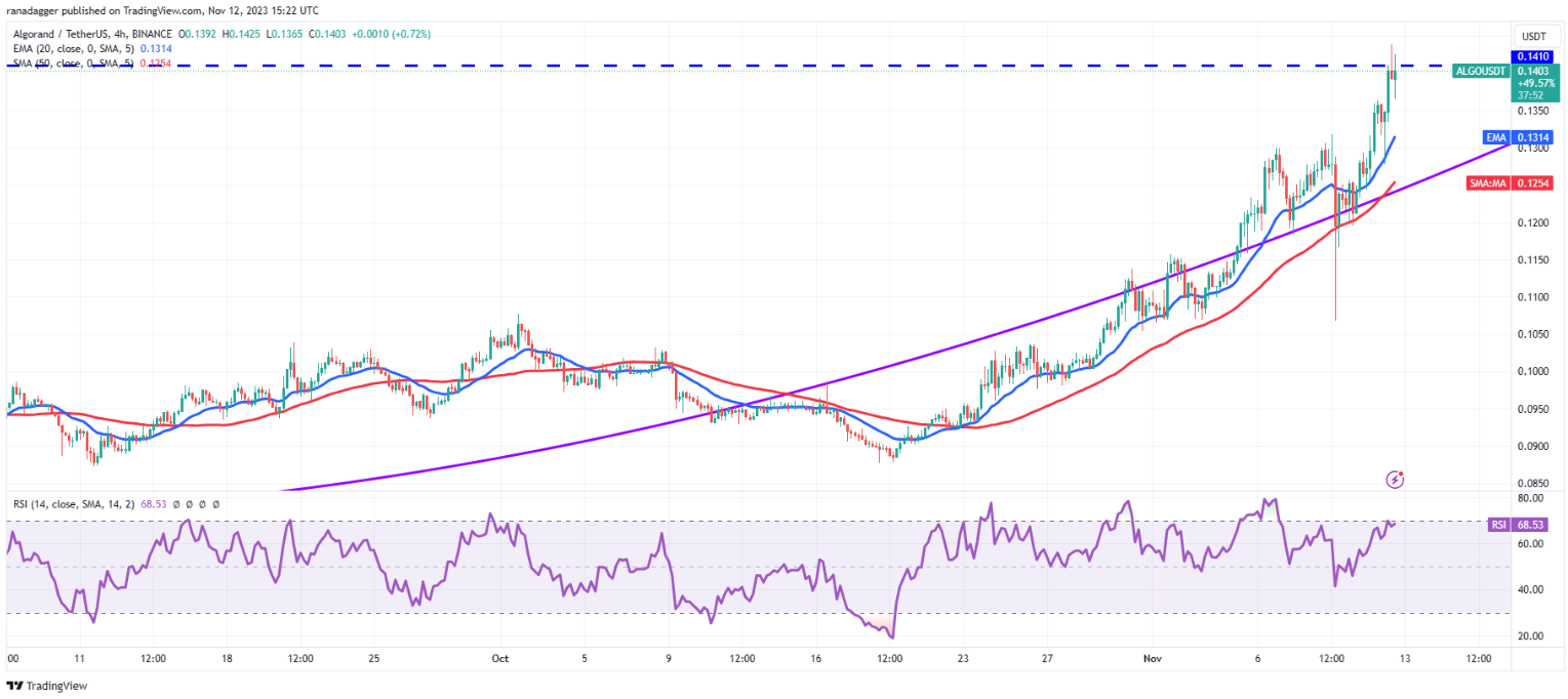 Ngoài ra, nếu giá giảm mạnh từ $0,14, điều đó sẽ cho thấy phe gấu tiếp tục bảo vệ mức này một cách mạnh mẽ. Sau đó, cặp ALGO/USDT có thể giảm xuống đường EMA 20 ngày ($0,12).