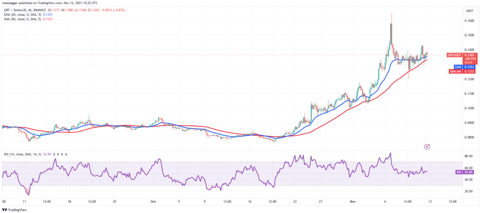 The Graph (GRT) đã điều chỉnh sau một động thái tăng mạnh, nhưng một dấu hiệu tích cực là phe bò đã cố gắng giữ giá trên đường EMA 20 ngày ($0,12).