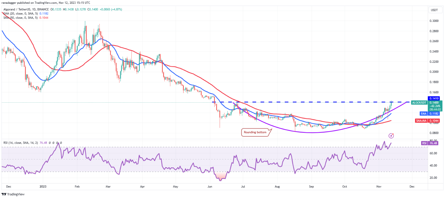 Algorand (ALGO) đang hình thành mô hình đáy tròn, mô hình này sẽ hoàn thành khi bứt phá và đóng cửa trên ngưỡng kháng cự phía trên ở $0,14.