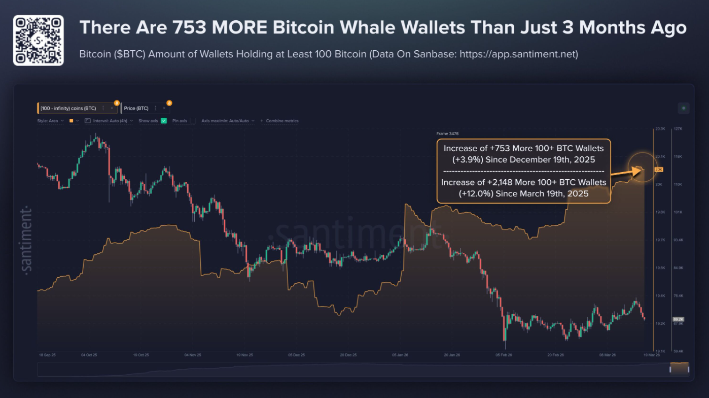 Số lượng ví cá voi Bitcoin tiếp tục gia tăng bất chấp thị trường giảm mạnh, cho thấy niềm tin của các nhà đầu tư lớn vẫn được duy trì. Theo Santiment, số ví nắm giữ từ 100 BTC trở lên đã tăng thêm 753 ví trong 3 tháng qua, tương đương mức tăng 3,9%.