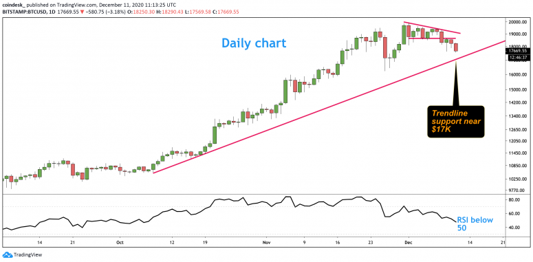 Do đó, hỗ trợ của đường xu hướng tăng trong 2 tháng, hiện ở mức 17,000 đô la, đang được tiết lộ. Một số nhà đầu tư quyền chọn đã định vị cho đợt pullback kéo dài, như đã thảo luận vào đầu tuần.