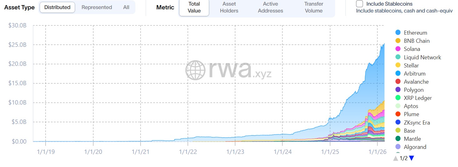Ethereum đang ngày càng củng cố vị thế dẫn đầu của mình với vai trò là lớp phân phối cho các tài sản thực (RWA), không bao gồm stablecoin | Nguồn: RWA.xyz