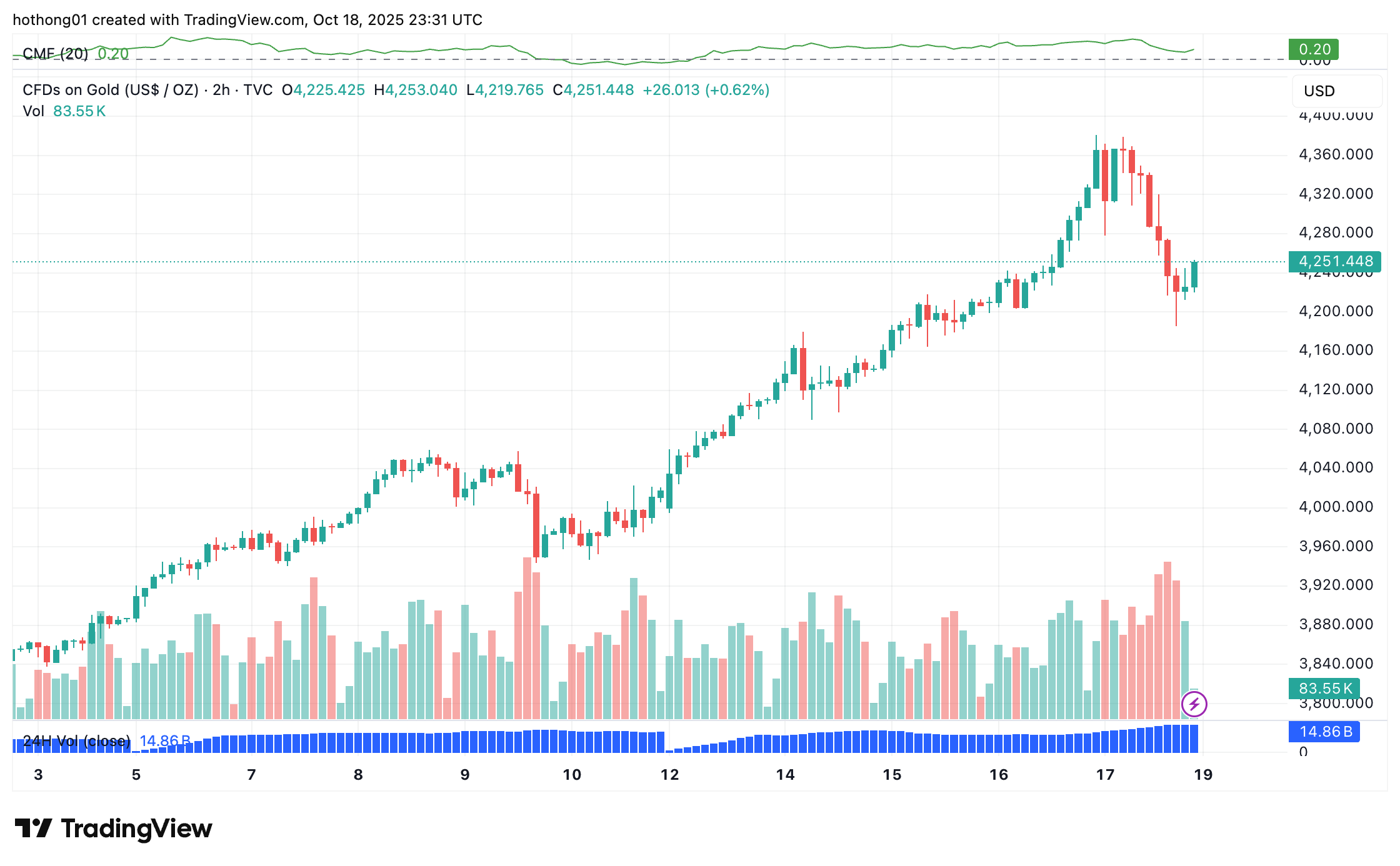Theo dữ liệu từ TradingView, giá vàng đã lập đỉnh lịch sử mới ở mức 4.376 USD/ounce vào ngày 17/10, nâng tổng vốn hóa thị trường vượt 30 nghìn tỷ USD.