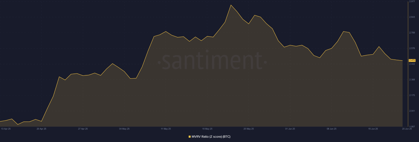 Chỉ số MVRV Z-score đã giảm xuống còn 2,47 từ mức đỉnh cục bộ 2,97 vào đầu tháng 6 — một dấu hiệu cho thấy phần lợi nhuận chưa thực hiện trên thị trường đang thu hẹp, sau đợt tăng mạnh hồi tháng 5.
