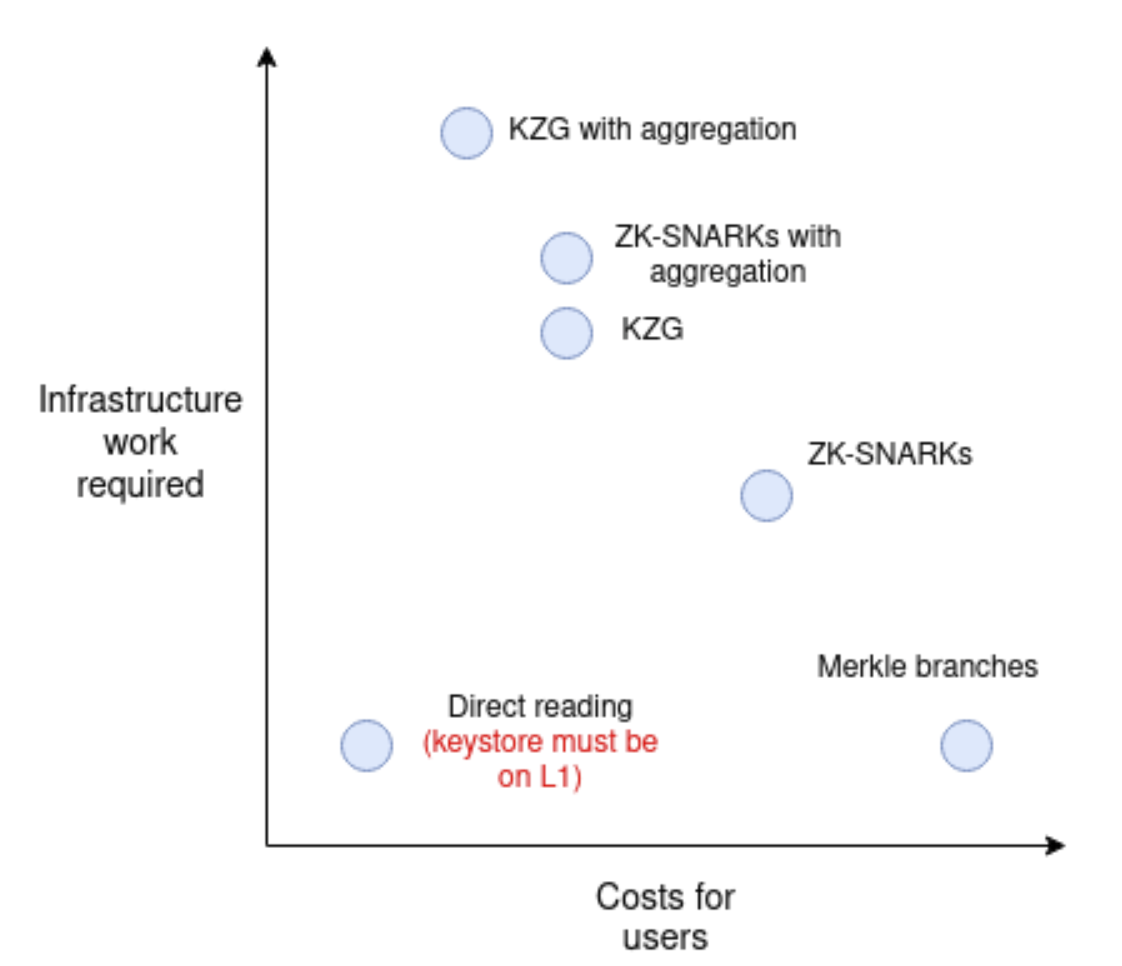 Buterin khám phá các kế hoạch bằng chứng khác nhau có thể tạo điều kiện giao tiếp cross-chain, bao gồm bằng chứng Merkle, ZK-SNARK, bằng chứng KZG cho mục đích đặc biệt và bằng chứng Verkle tree. Mỗi kế hoạch có khối lượng công việc cơ sở hạ tầng và ngụ ý chi phí riêng, với ZK-SNARK mang lại sự cải thiện đáng kể so với bằng chứng Merkle về chi phí gas nhưng vẫn tương đối đắt. Bằng chứng KZG có mục đích đặc biệt cung cấp giải pháp thay thế hiệu quả hơn, tận dụng các cam kết của KZG để giảm chi phí, trong khi bằng chứng Verkle tree tạo ra sự cân bằng giữa KZG và ZK-SNARK.