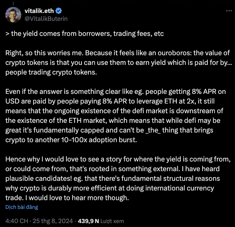 Trong bài đăng ngày 25 tháng 8 trên X, Buterin bày tỏ sự nghi ngờ về tiềm năng của DeFi trong việc thúc đẩy tăng trưởng đáng kể trong lĩnh vực tiền điện tử.