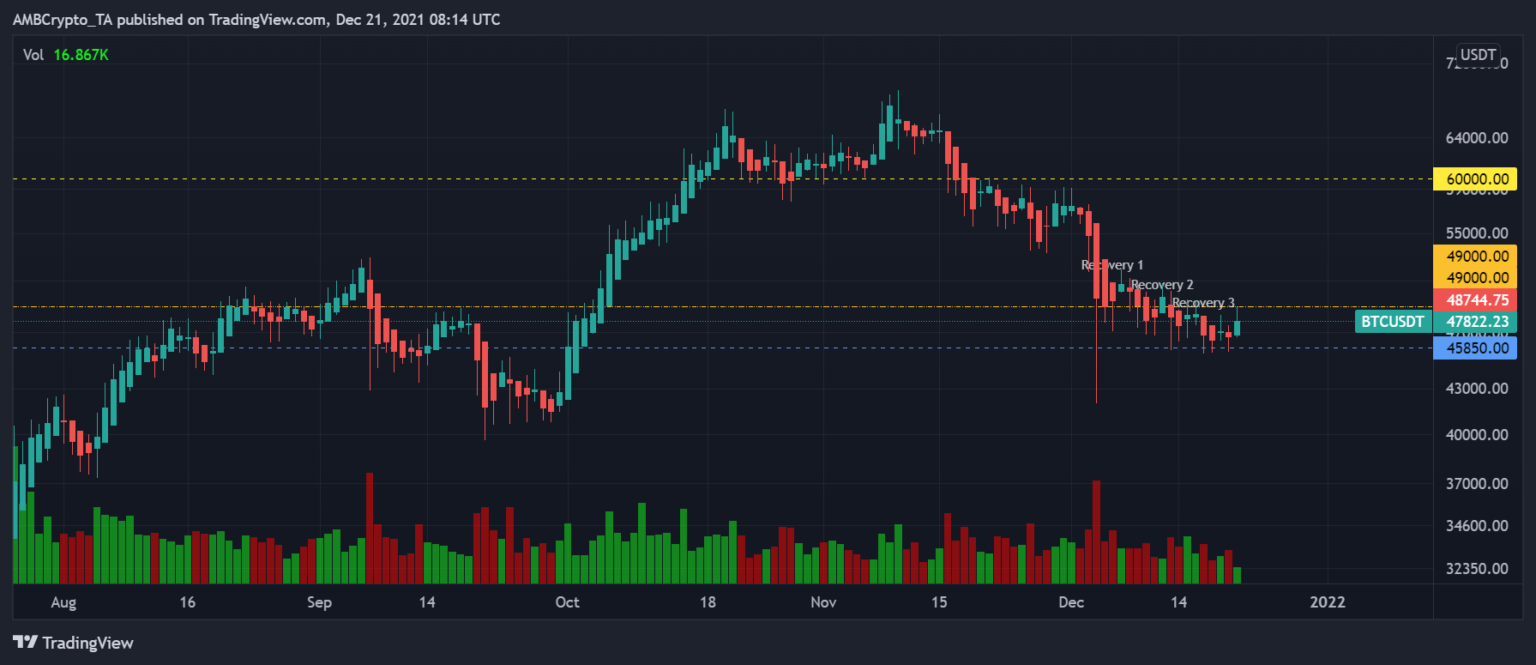 Do đó, mặc dù thiết lập vĩ mô có thể là xu hướng giảm trong ngắn hạn, nhưng vẫn có những dấu hiệu tăng giá on-chain đối với Bitcoin. Hơn nữa, khi năm 2021 sắp kết thúc, BTC có thể dao động theo cả hai hướng nên sẽ rất thú vị để theo dõi.