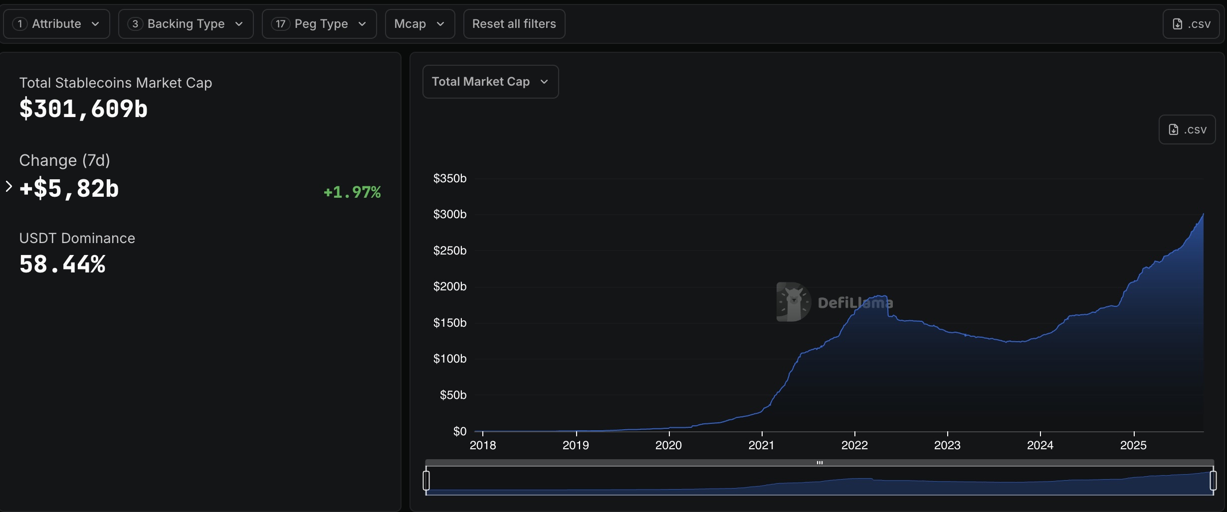 Theo dữ liệu từ DeFiLlama, tổng vốn hóa thị trường stablecoin đã chính thức vượt qua ngưỡng 300 tỷ USD – cột mốc lịch sử đối với lĩnh vực tài sản số.