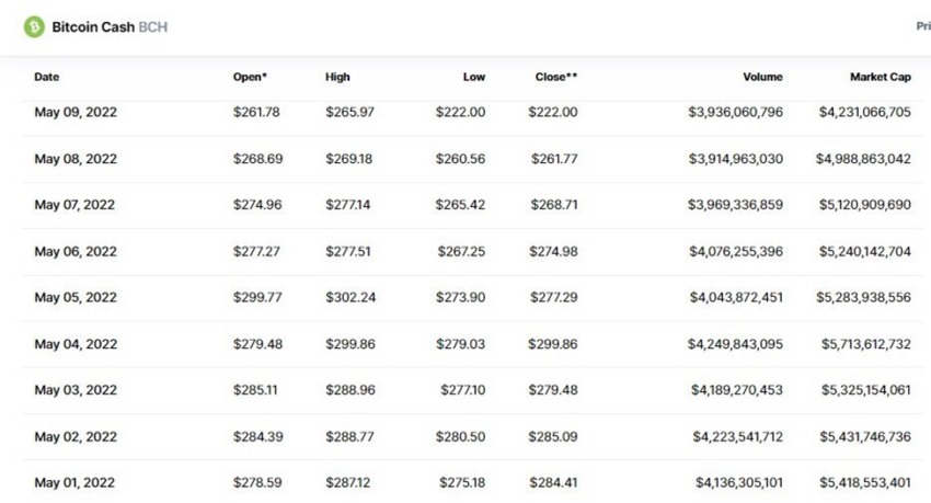 Dữ liệu lịch sử của BCH | Nguồn: CoinMarketCap